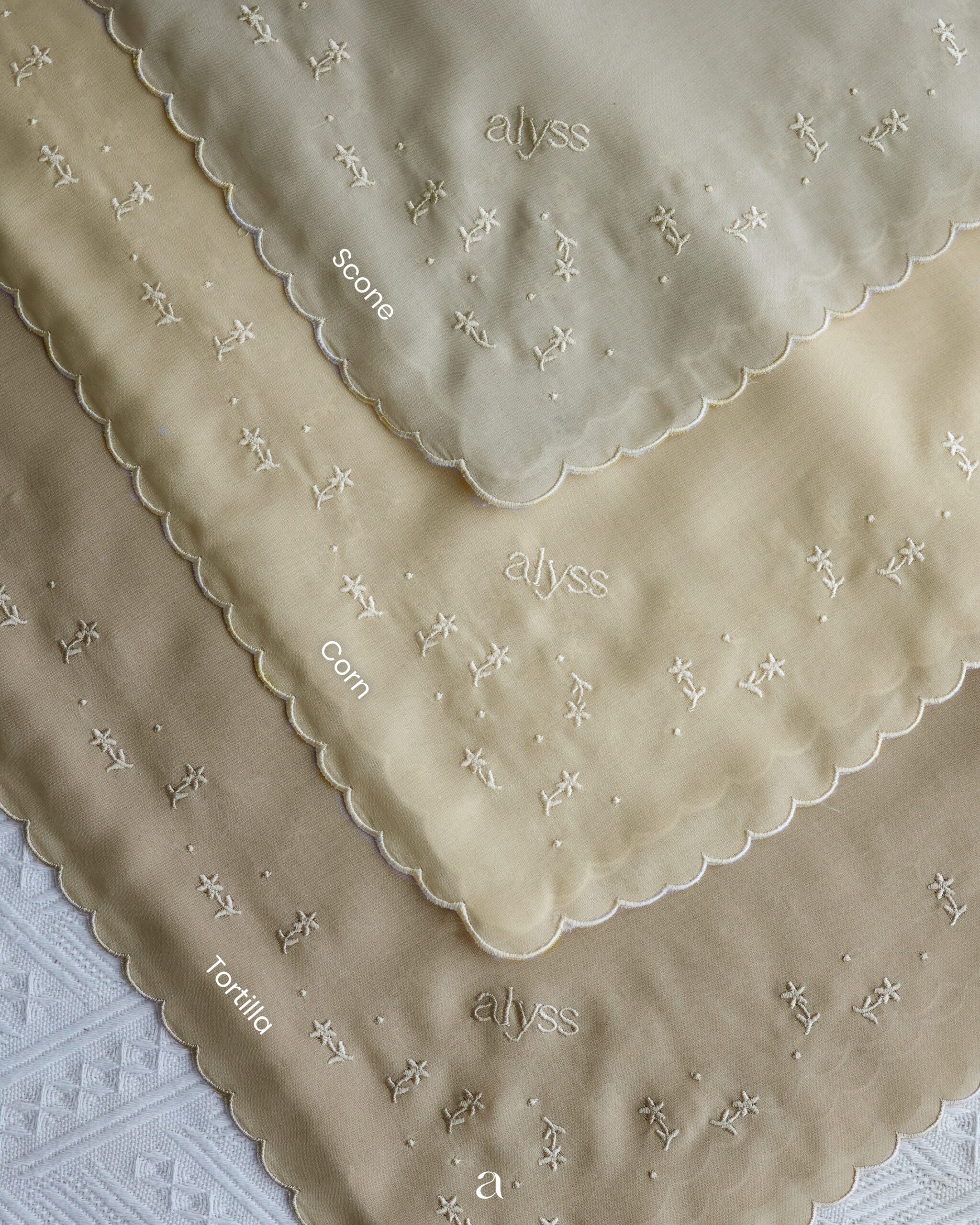Floral motifs at one corner of the scarf.